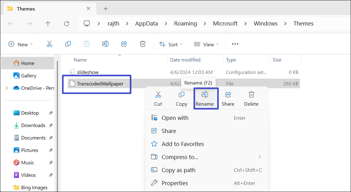 2. Kun teemakansio avautuu, nimeä tai poista uudelleen ”Transkoodattu taustakuva”Tiedosto. Napsauta hiiren kakkospainikkeella tiedostoa ja valitse”Nimetä uudelleen". Vaihda nimi nimeksi "Transcoded Taustakuva.Bak ”tai jotain muuta.