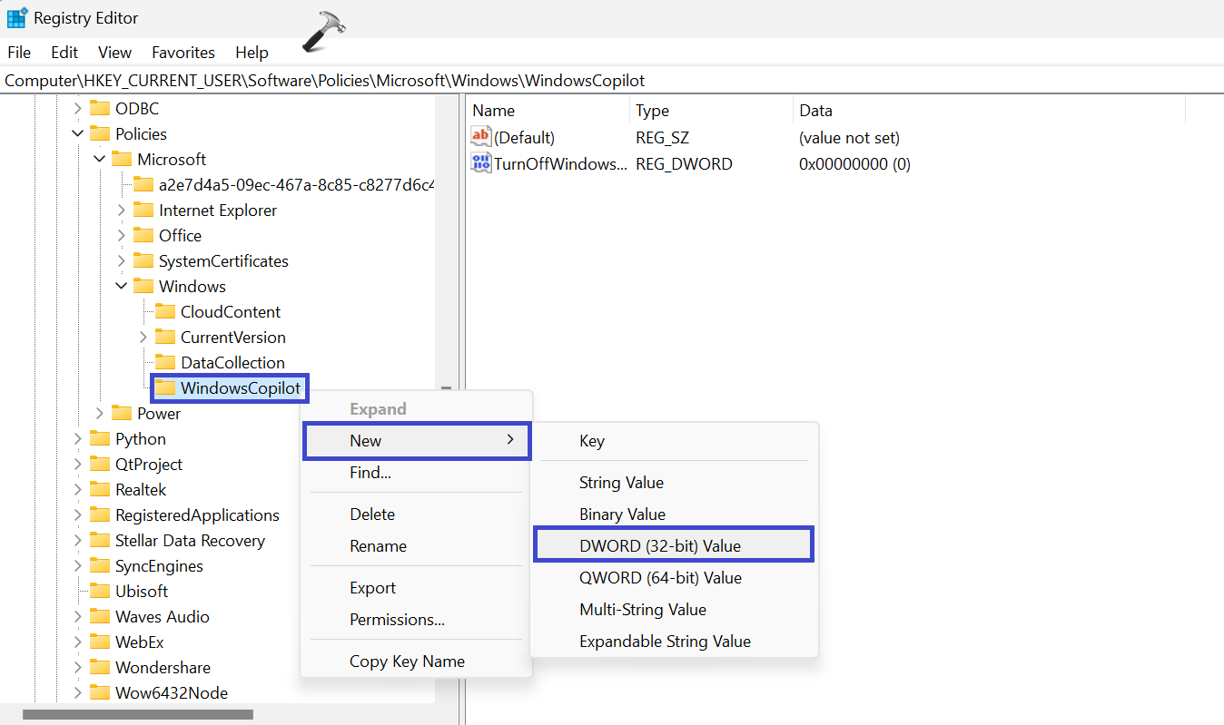 3. Ensin sinun on luotava uusi rekisteriavain nimeltä "WindowsCopilot”-näppäintä.