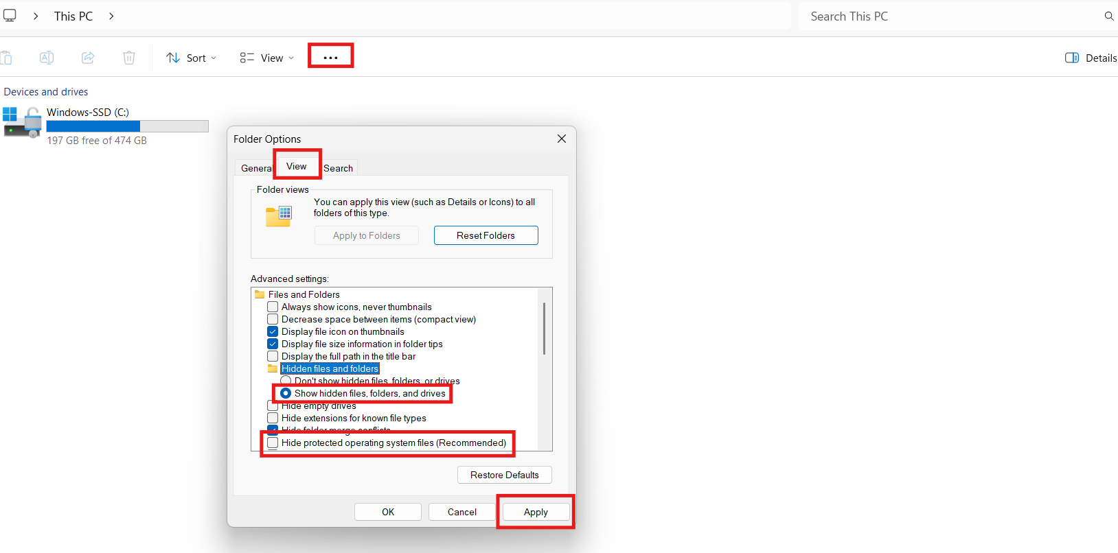 2. Ota käyttöön "Näytä piilotetut kohteet" ja poista valinta "Piilota suojatut käyttöjärjestelmätiedostot" Näytä-asetuksista.