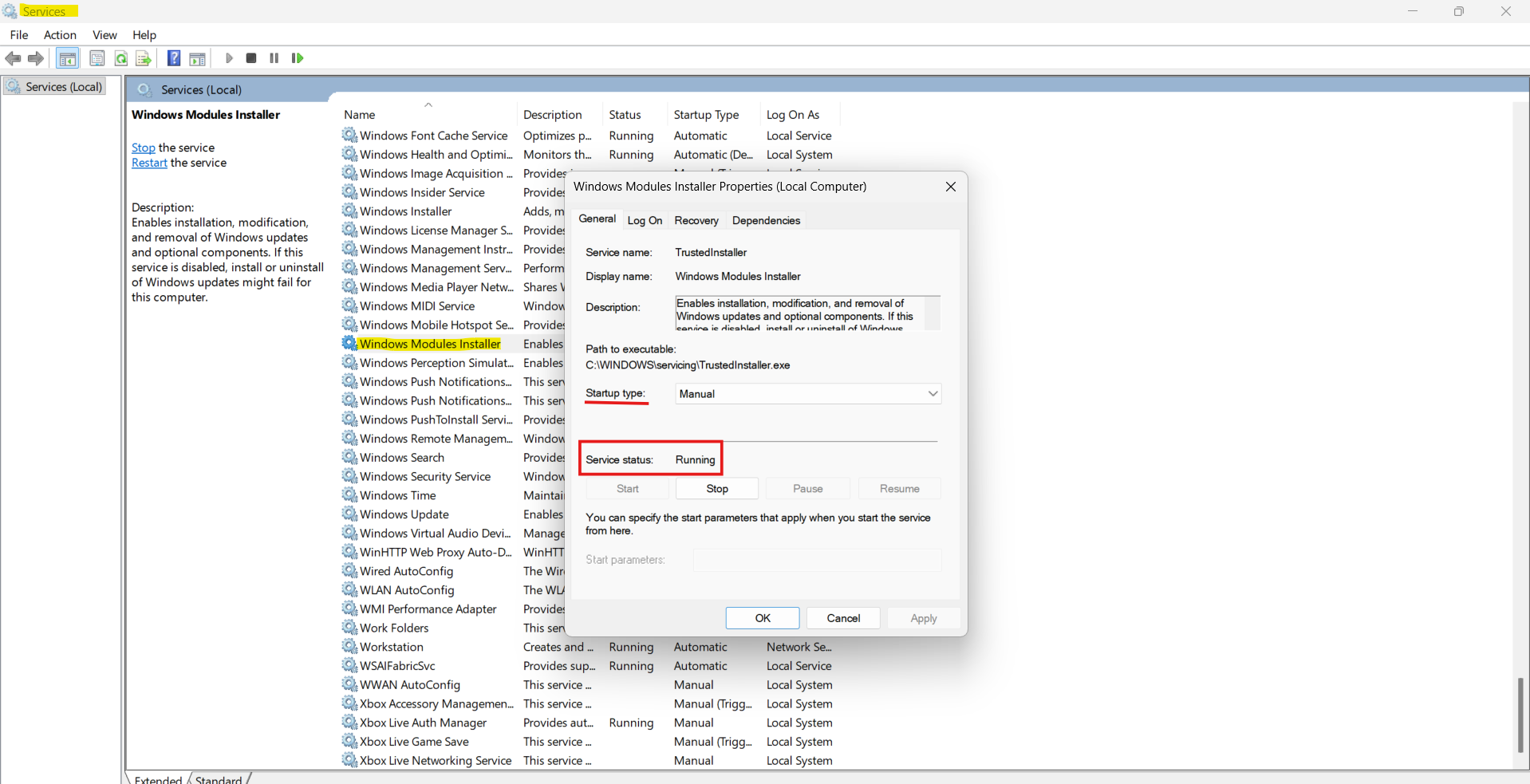 2. Etsi Windows Modules Installer ja avaa sen ominaisuudet.