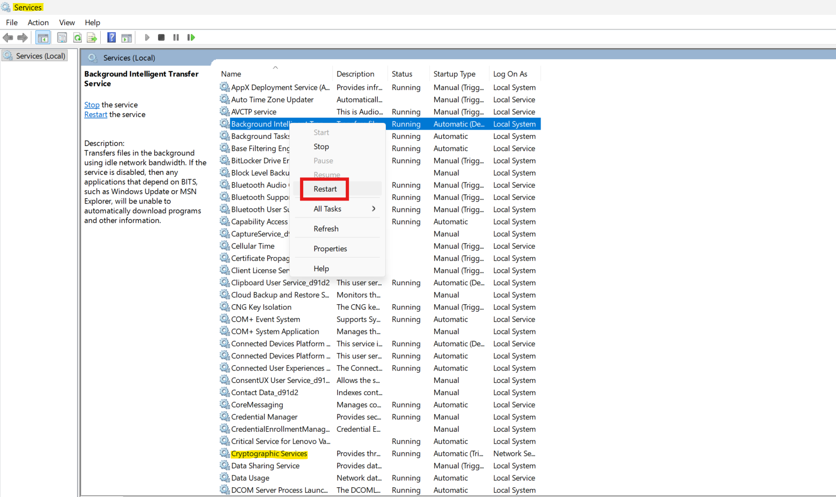 Korjaus 3: Käynnistä tärkeät päivityspalvelut uudelleen korjataksesi virhekoodin 0x80070032 Windows 11/10:ssä