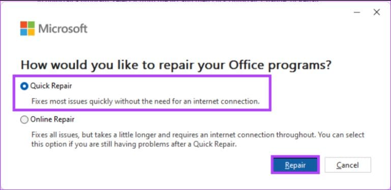 Uusimpien Windows-päivitysten asentaminen saattaa myös auttaa ratkaisemaan ongelman. Näin ollen tietokoneen tulee sisältää sekä Microsoft Officen että Windowsin uusimmat versiot. Mutta jos ongelma jatkuu, yritä korjata Office-asennus.
