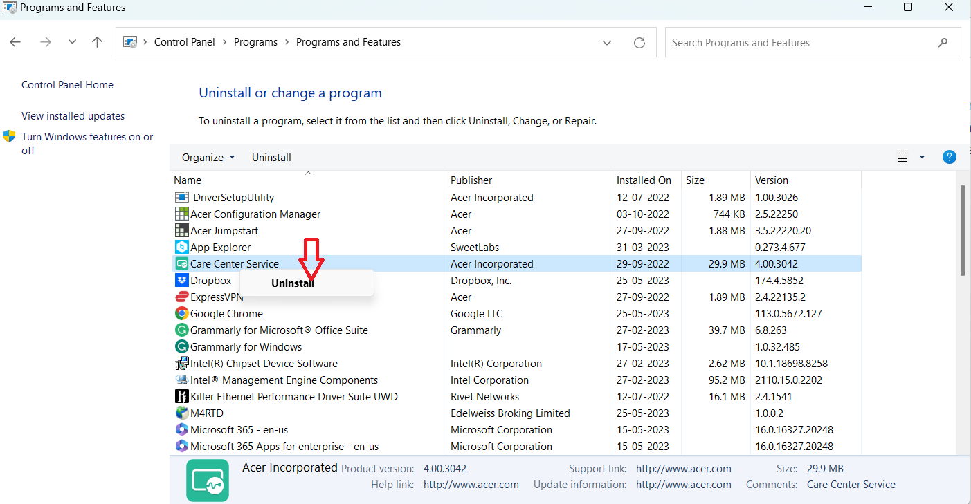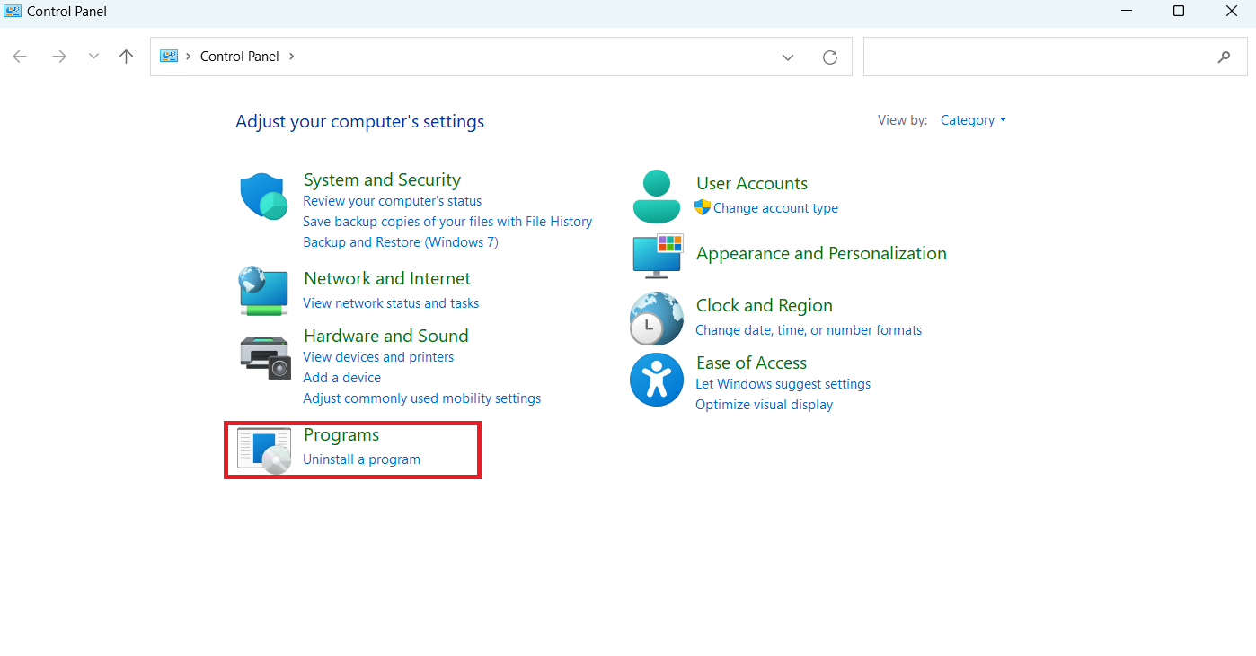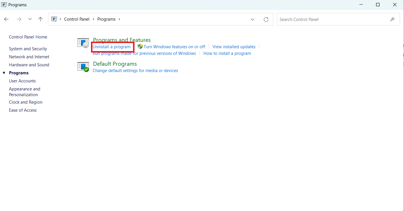 Seuraavaksi napsautaPoista ohjelmasisä-Ohjelmat ja ominaisuudet.