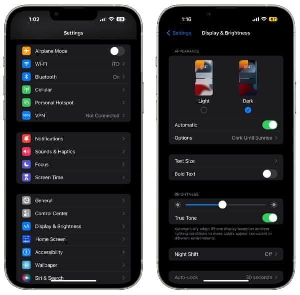 Tumman tilan pitäisi auttaa parantamaan iOS 15:n akun tyhjenemisongelmia iPhoneissa, joissa on OLED-näyttö, kuten iPhone 11 Pro, iPhone 12, iPhone 13 jne. Siirry vain ohjauskeskukseen, paina Kirkkaus-liukusäädintä ja napauta sitten Ulkoasu-painiketta vaihtaaksesi vaalean ja tumman tilan välillä.