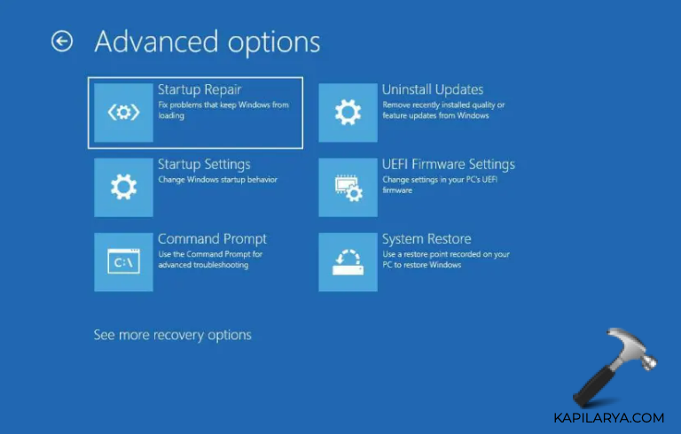 Valitse 5. Lisäasetukset -valikossa ”Käynnistyskorjaus”.
