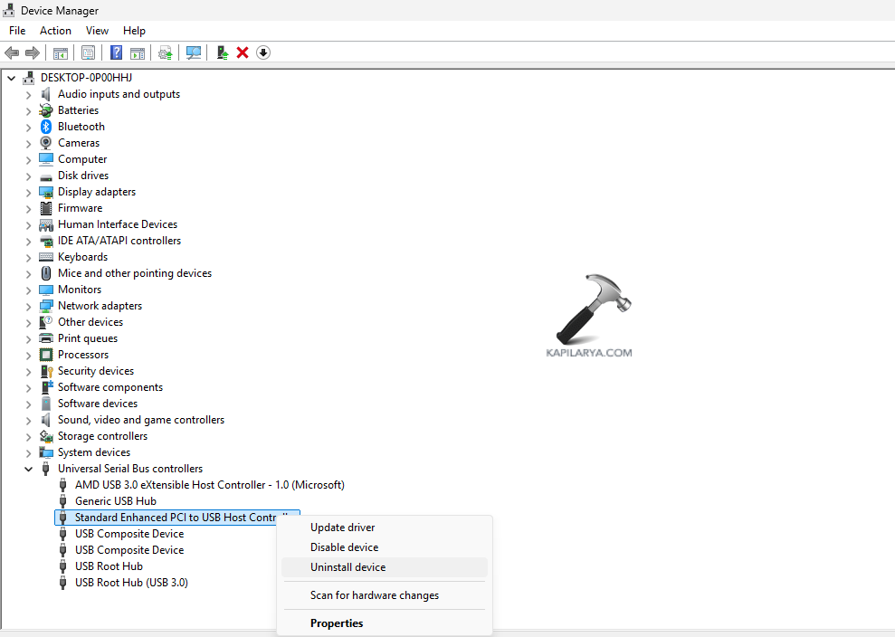 Vaihe 1-Siirry laitepäälliköihin. Etsi USB -ohjain nimen isäntäohjaimella Universal Serial Bus -ohjaimen alla. Sen jälkeen napsauta sitä hiiren kakkospainikkeella ja valitse asennuksen poistaminen.