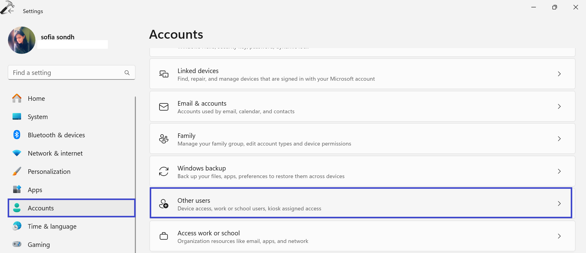 1. Siirry kohtaan “Asetukset => tilit => muut käyttäjät".