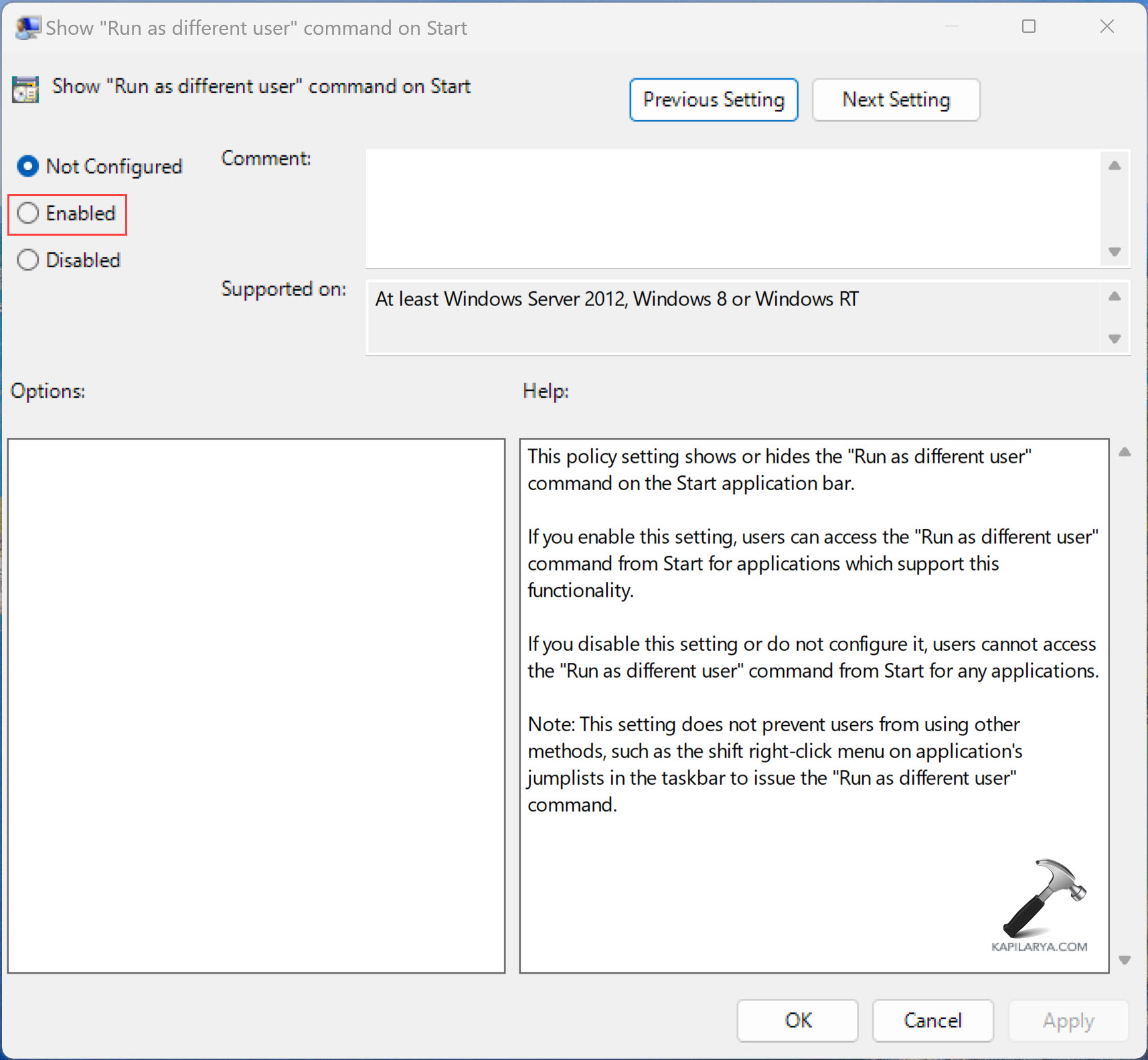 3. Seuraavaksi napsauta ”Näytä Suorita eri käyttäjäkomennona käynnissä” ja aseta sitten sen arvo nimellä “Enabled”. Viimeiseksi, sinun on napsautettava painikkeita “soveltaa” ja “OK” tehdäksesi muutokset.