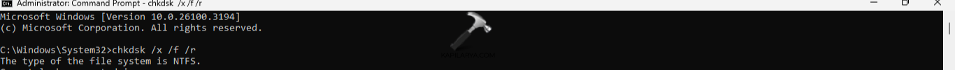 Vaihe 2-Kopioi ja liitä alla annettu kehote suorittaaksesi CHKDSK-komennon ja paina Enter.