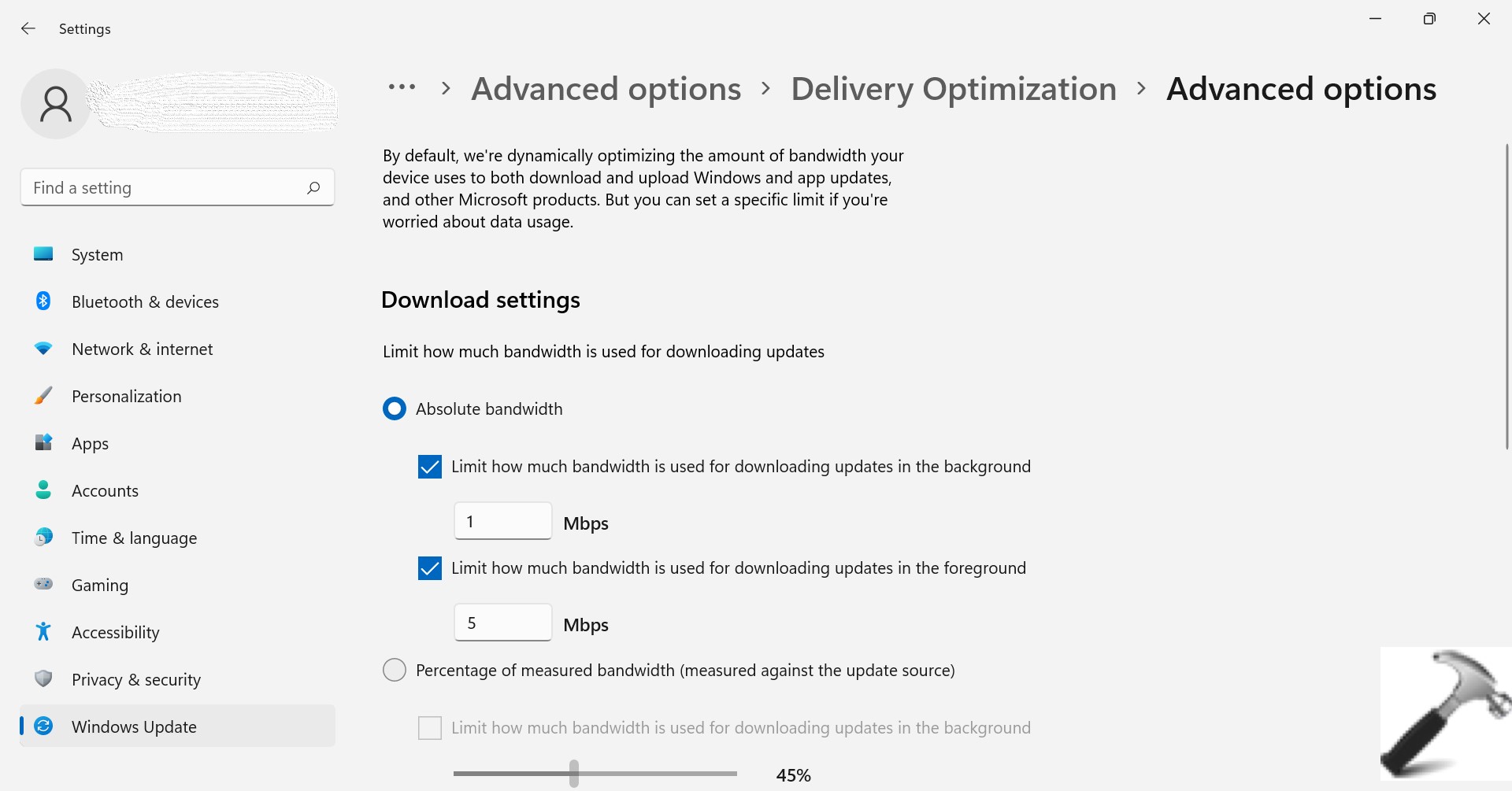 5. AlleLataa asetukset, valitse Absoluuttinen kaistanleveys ja merkitse molemmat valintaruudut rajoittaaksesi kaistanleveyden varaamista päivitysten lataamisen aikana. Määritä sitten, kuinka paljon kaistanleveyttä varataan. Muussa tapauksessa voit valita Prosenttiosuus mitatusta kaistanleveydestä -vaihtoehdon.