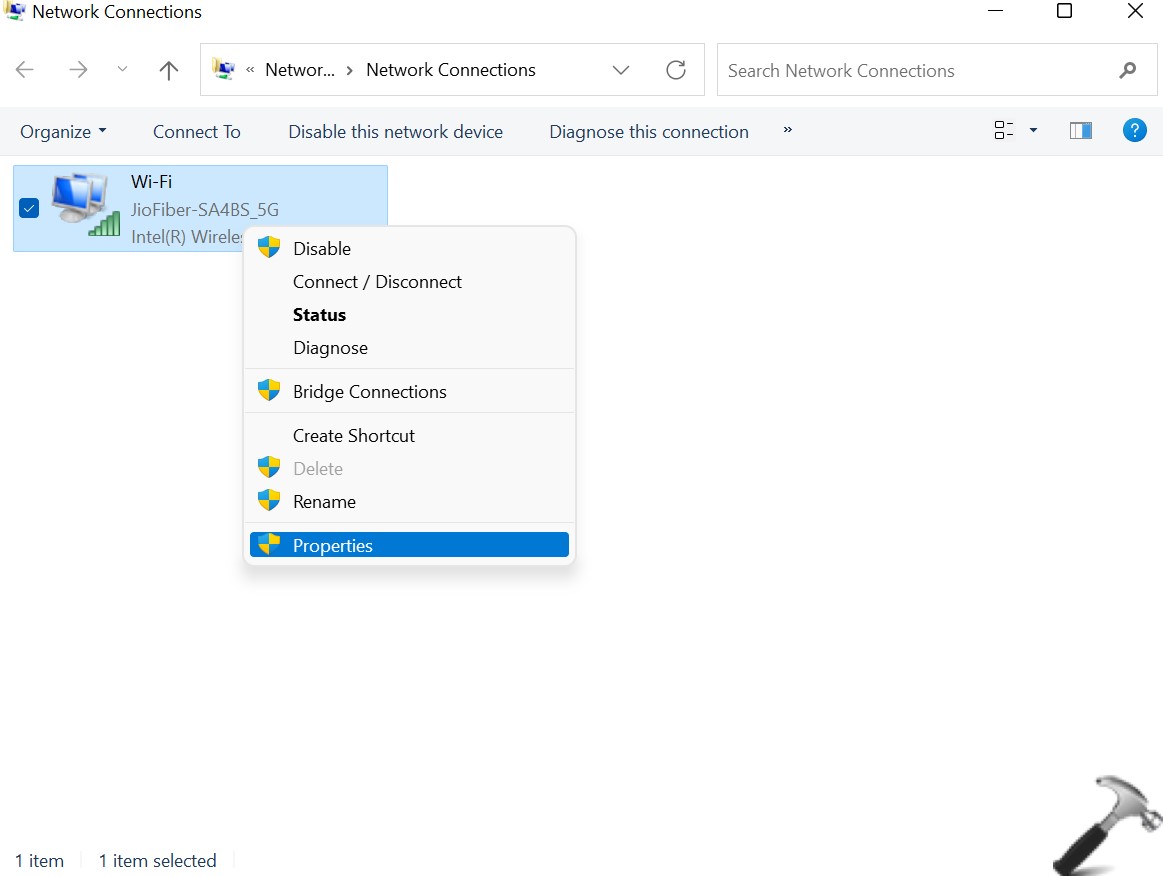 3. ValitseVerkkoyhteysikkuna. Napsauta sitten hiiren oikealla painikkeella omaasiInternet-yhteysja valitse Pominaisuudet.