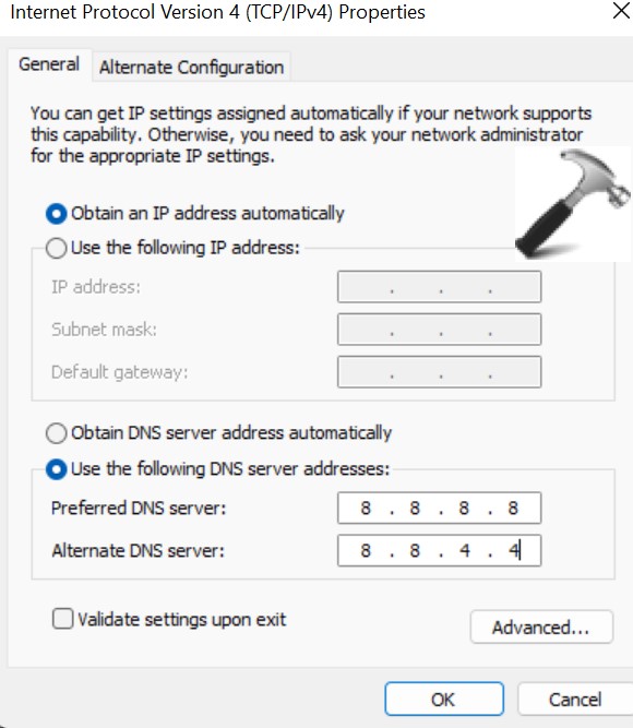 5. Valitse Yleiset-välilehdestä Käytä seuraavia DNS-palvelinosoitteita. Kirjoita Preferred DNS Server- ja Alternate DNS Server -kohtaan '8.8.8.8' ja '8.7.4.4' vastaavasti. Paina sitten Ok.