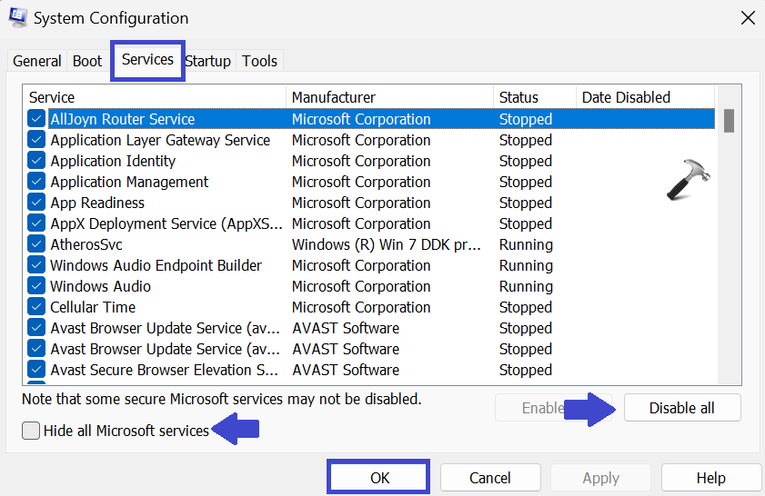 2. Valitse Palvelut-kohdasta Piilota kaikki Microsoft-palvelut -ruutu.