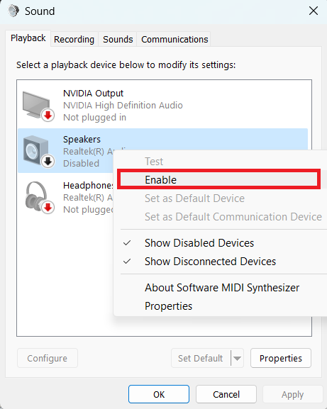 - Napsauta sitten hiiren kakkospainikkeella äänilähtöäsi ja valitseOta käyttöönvaihtoehto.