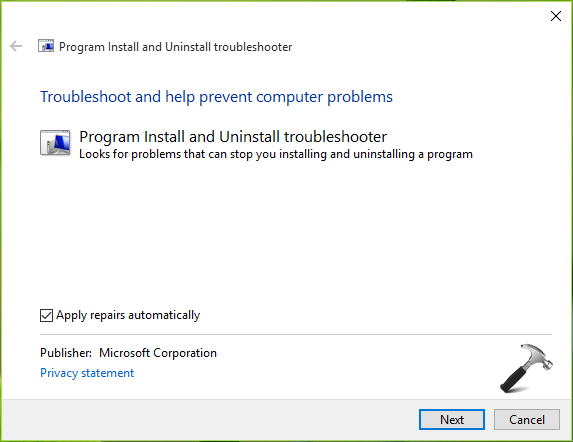 1.Kun lataat ohjelman asennus- ja poisto vianmääritystä yllä olevalla linkillä, Windows suorittaa sen automaattisesti sen ladattuaan. Alla olevassa ikkunassa tarkistaKäytä korjauksia automaattisestija napsautaSeuraava.