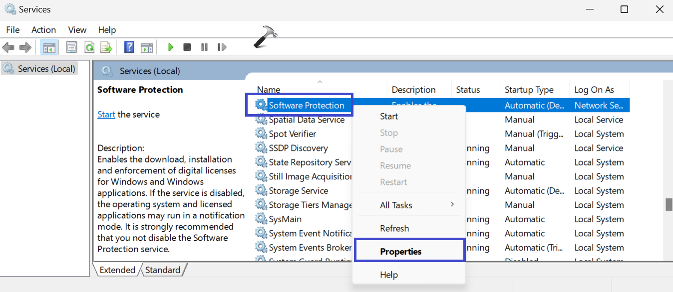 2. etsivät ”Ohjelmistosuoja”Vaihtoehto. Napsauta hiiren kakkospainikkeella sitä ja valitse”Alkaa".