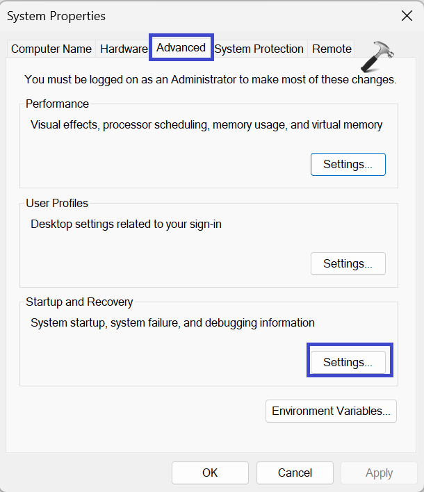Napsauta Lisäasetetta -välilehdessä ”Asetukset"Alle"Käynnistys ja toipuminen ”.