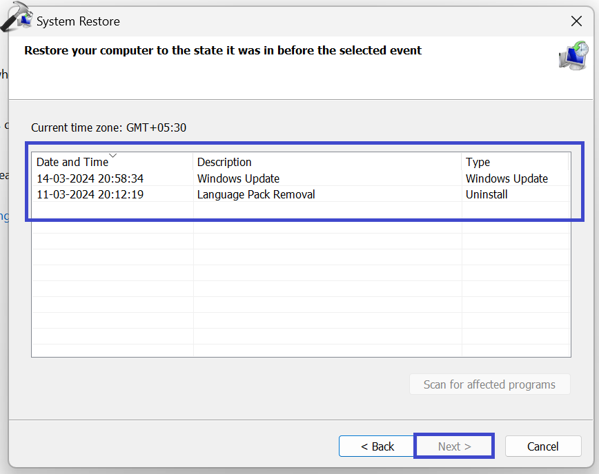 3. Valitse palautuspiste ja napsautaSeuraava.