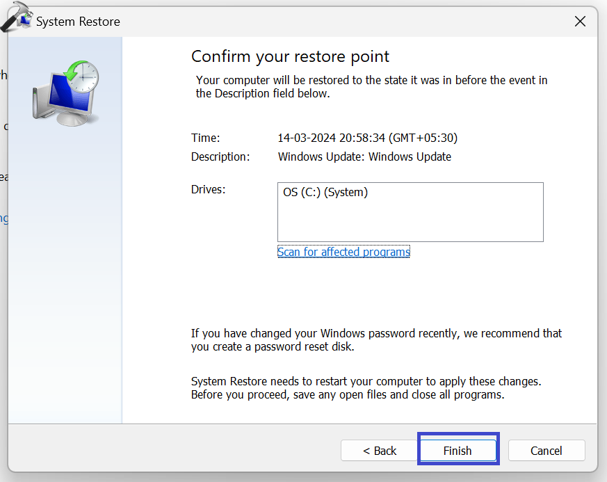 4. Tarkista yksityiskohdat ja napsauta ”Viimeistely”Jatka järjestelmän palautusprosessia.