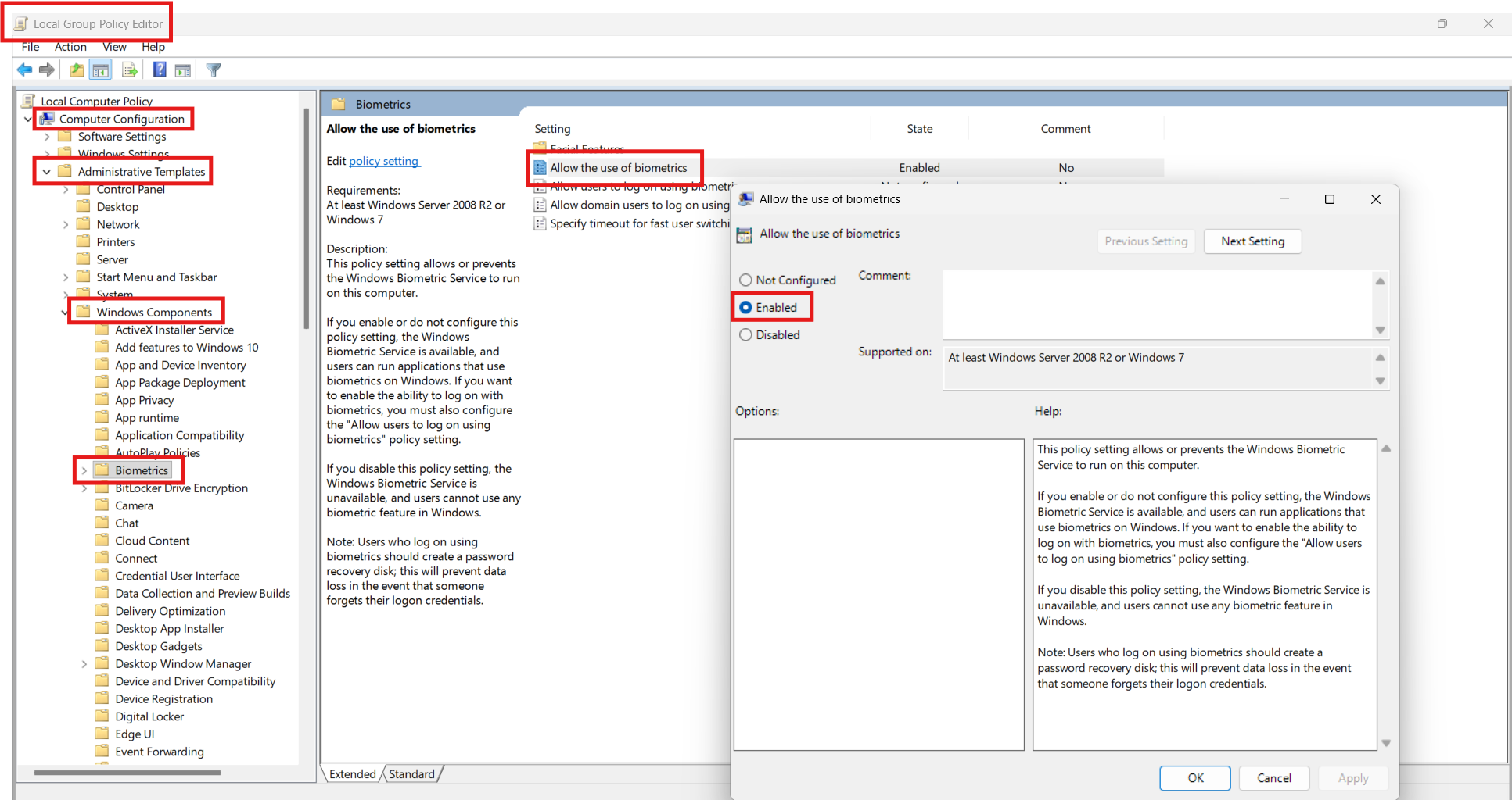 Korjaus 3: Ota biometriset tiedot käyttöön ryhmäkäytännössä