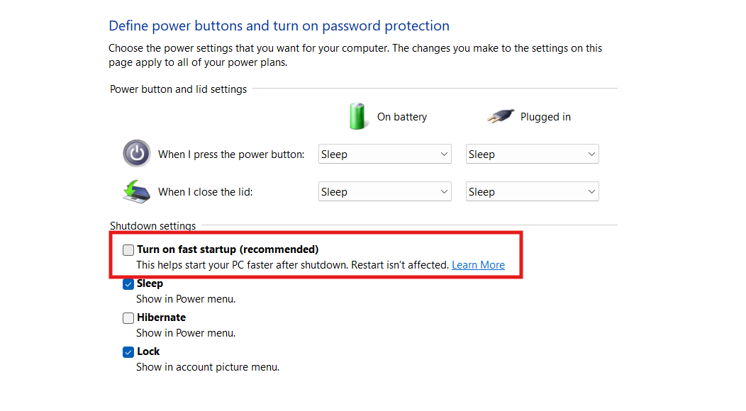 4. Poista valinta kohdasta "Ota nopea käynnistys käyttöön" (suositus).