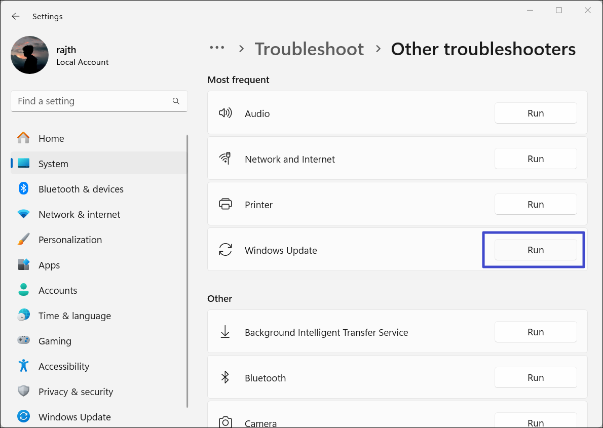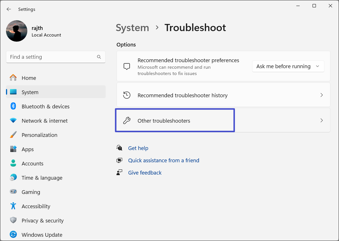 2. Valitse vianetsintä -asetusten sivulla “Valitse”Muut vianetsijät"Tai"Ylimääräiset vianetsijät”(Windows 10).