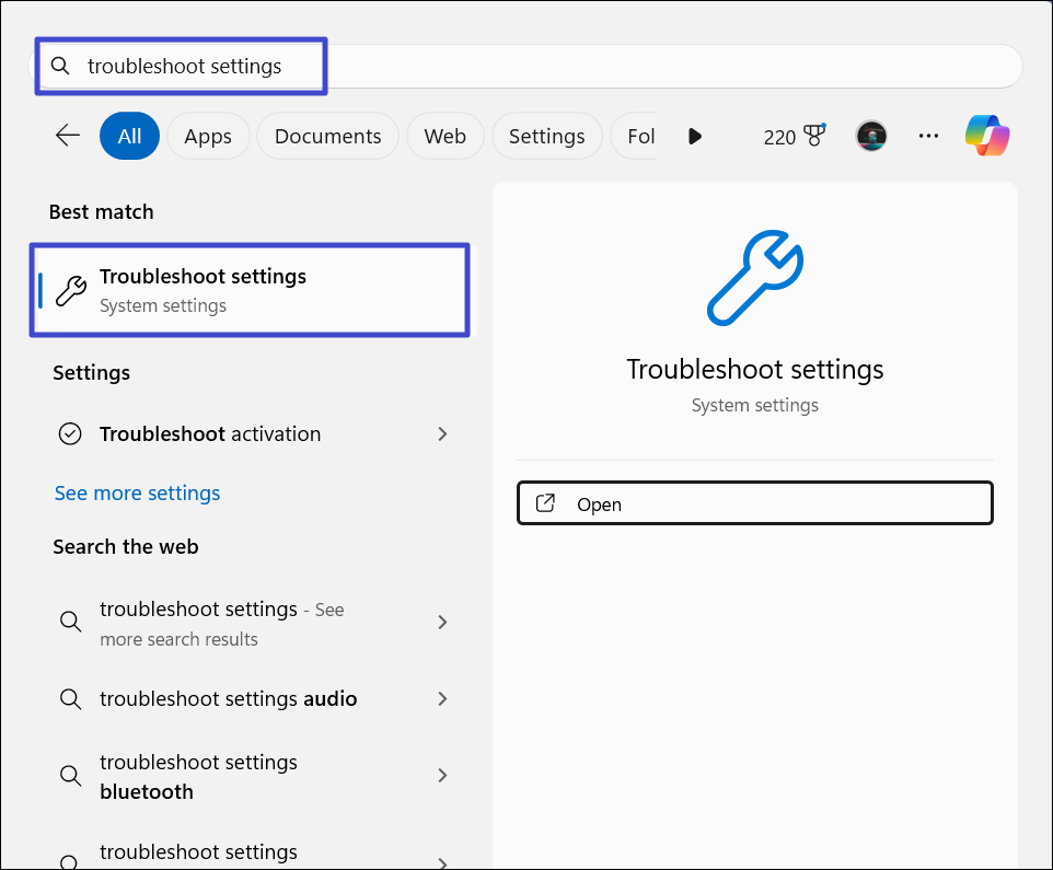 1. Avaa Windows -haku, kirjoita “Vianmääritys Asetukset”Ja valitse ylin tulos.