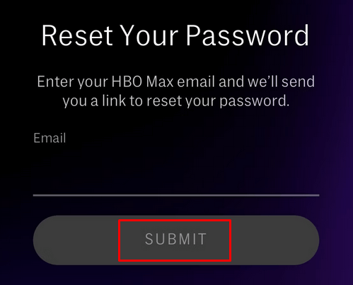 - Kirjoita sähköpostiosoitteesi ja napautaLähettää. Aivan kuten yllä on kuvattu, sinun on käytettävä alkuperäistä HBO Max -tilitiedostoa.
