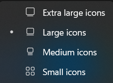 2.Nyt saatneljä vaihtoehtoavalita seuraavista:Pienet kuvakkeet, keskikokoiset kuvakkeet, suuret kuvakkeet, jaErittäin suuret kuvakkeet.Voit valita sen, mikä sinusta tuntuu paremmalta.