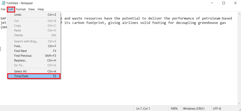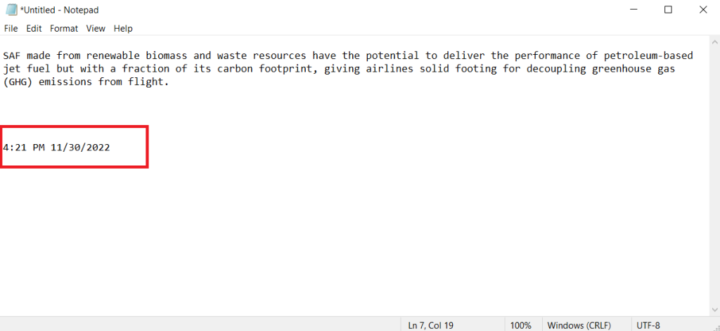 3.Löydät nykyisen ajan ja päivämäärän, joka on kuvattu Notepad -asiakirjassa.