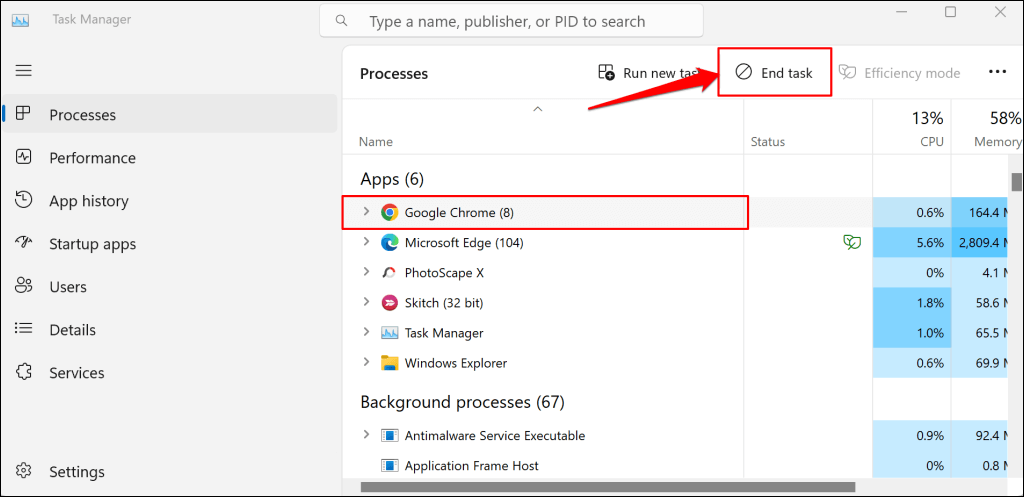 Avaa Windowsissa Tehtävienhallinta (painaCtrl+Siirtää+Esc), valitse Google Chrome ja valitseLopeta tehtävä.