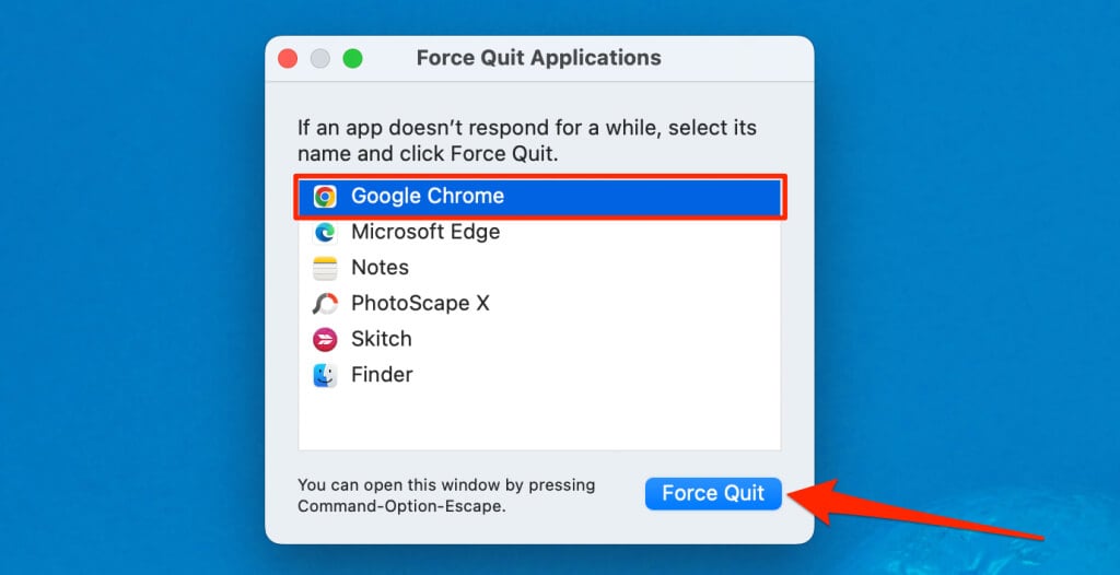 Jos käytät Macia, painaKomento+Vaihtoehto+Paeta, valitseGoogle Chromeja valitsePakota lopettamaan.