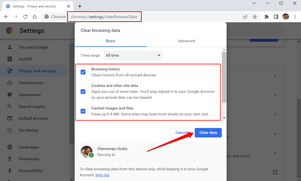 - Liitächrome://settings/clearBrowserDataChromen osoitepalkissa ja painaEntertaiPalatanäppäimistölläsi.