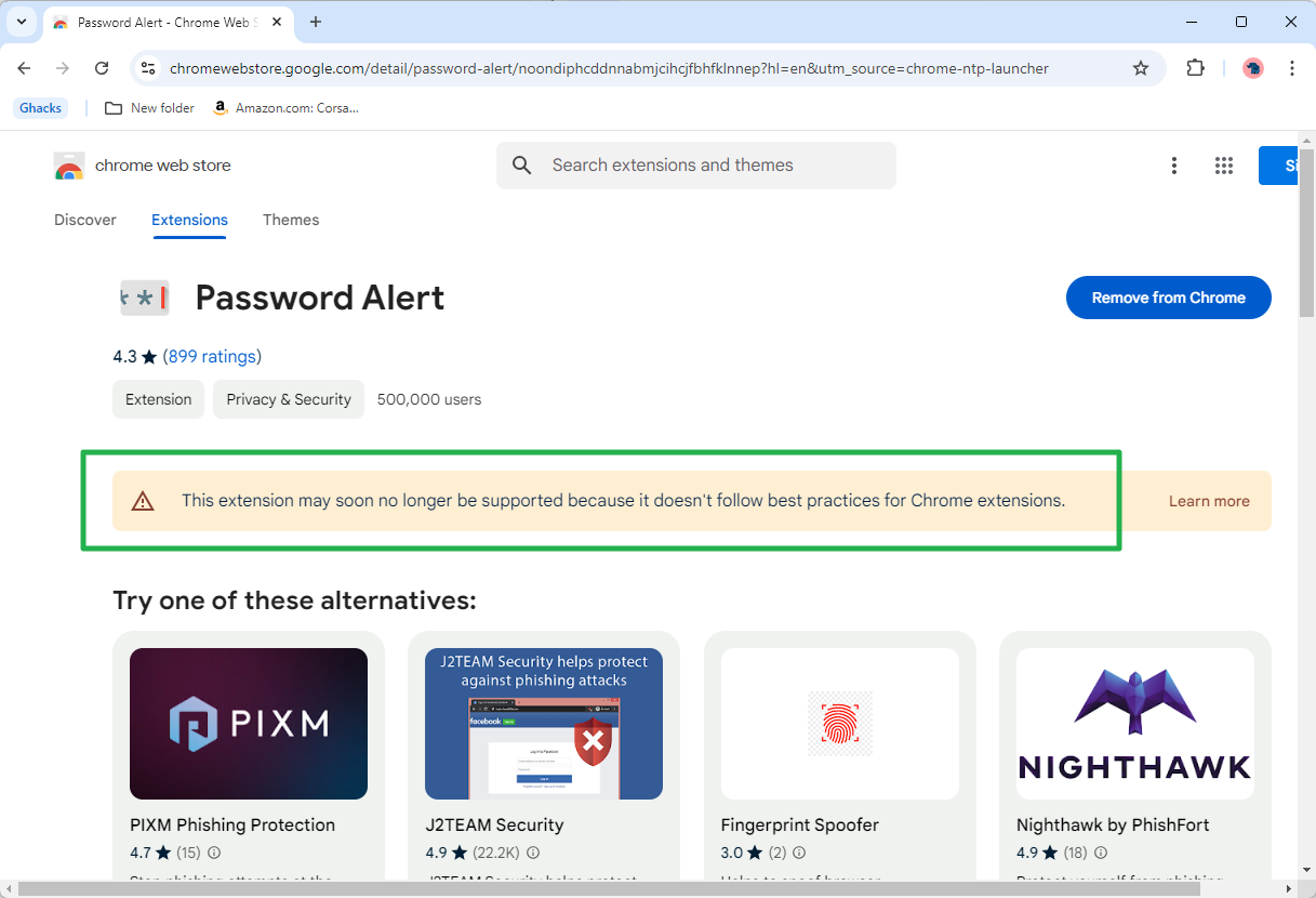 Avaa laajennuksen Chrome Web Store -sivu. Jos saat viestin "hänen laajennusta ei ehkä pian enää tueta, koska se ei noudata Chrome-laajennusten parhaita käytäntöjä." lähellä sivun yläosaa, se poistetaan käytöstä, ellei kehittäjä päivitä sitä.