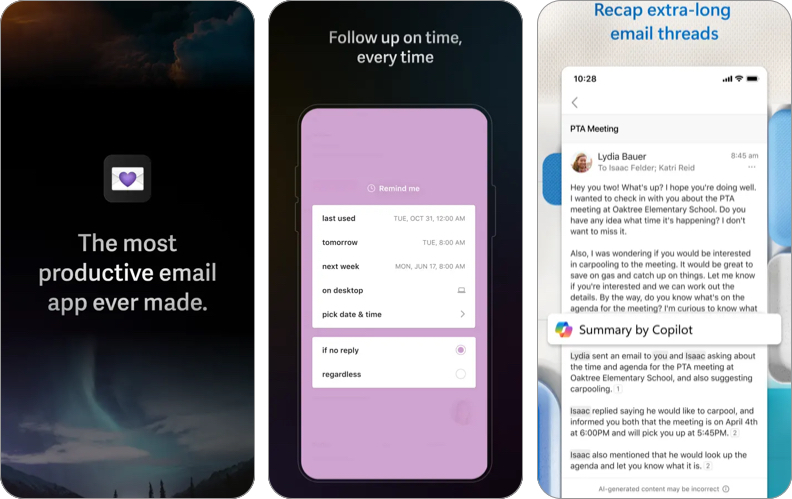 Kanarian Mail integroi Copilot AI: n auttamaan kirjoittamista, oikolukua ja yhteenvetoa sähköpostien. Se toimii myös AI -assistenttina tuottavuuden lisäämisessä. Muita ominaisuuksia ovat lukukuitit, yhtä napsautusta tilausta, torkku ja kalenterin integrointi. Jos tarvitset edistynyttä sähköpostisovellusta iPhonelle tai iPadille, tämä on syytä harkita.