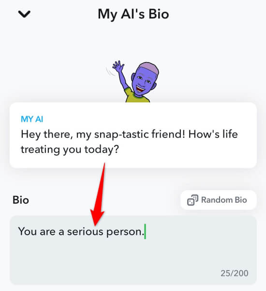 Jos sinulla on Snapchat+ -tilaus, voit muuttaa AI: n käyttäytymistä. Voit lisätä BIO: n AI: lle, joka kertoo chatbotille, mitä persoonallisuutta käytetään. Voit esimerkiksi pyytää chatbotia olemaan vakava henkilö, ja chatbot vastaa sitten vakavasti kysymyksiisi.