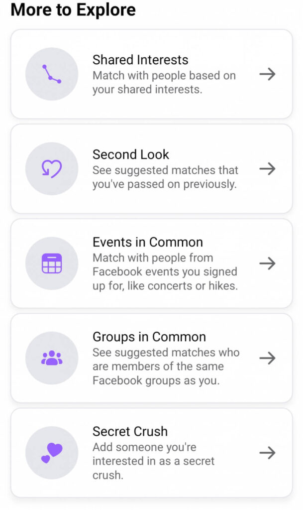 Vieritä alas päätreffisivulle ja löydät osion nimeltäLisää tutkittavaa. Täältä löydät hyödyllisiä Facebook Dating -ominaisuuksia, muun muassaSalainen ihastus. Tämän ominaisuuden avulla voit löytää ihmisiä, joiden kanssa olet jo ystäviä alkuperäisistä Facebook- ja Instagram-profiileistasi. Voit pitää niistä ja luoda Secret Crush -luettelosi, johon mahtuu jopa yhdeksän ystävää.