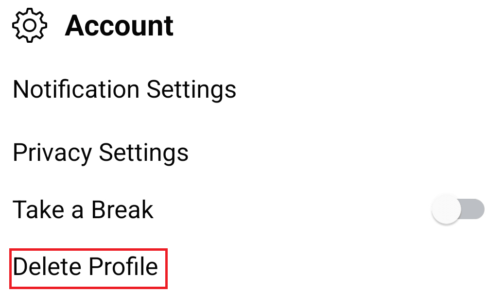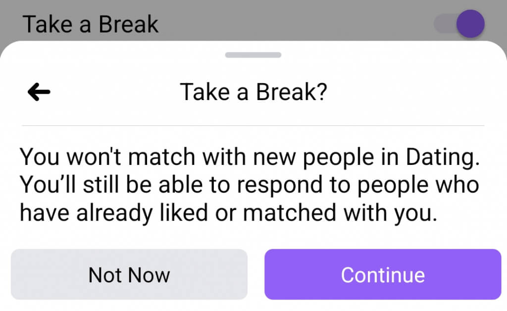 Huomaa, että jos et halua poistaa deittailuprofiiliasi pysyvästi, mutta tarvitset tauon siitä, voit aina valita Take a Break -vaihtoehdon. Tällä tavalla profiilisi keskeytetään, et saa treffi-ilmoituksia etkä näy kenellekään otteluehdotuksena. Ota tämä vaihtoehto käyttöön napauttamallarataskuvake, jota seuraaKenraalivälilehti,Tili, ja vaihda vieressä olevaa kytkintäPidä tauko.