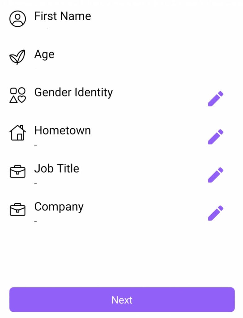 Facebook itse tuo tiedot, jotka asetit saataville alkuperäisessä profiilissa. Voit kuitenkin nyt hallita sitä, mitä näytetään. Nyt on aika rakentaa profiilisi. Voit poistaa tiedot napauttamallaXtai muuta sitä napauttamalla kynämerkkiä.