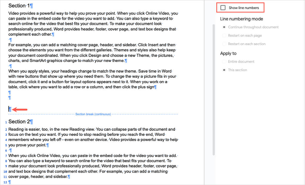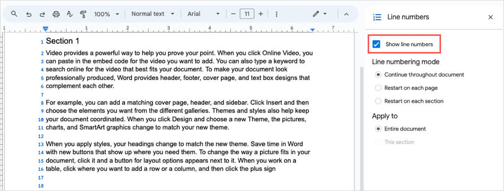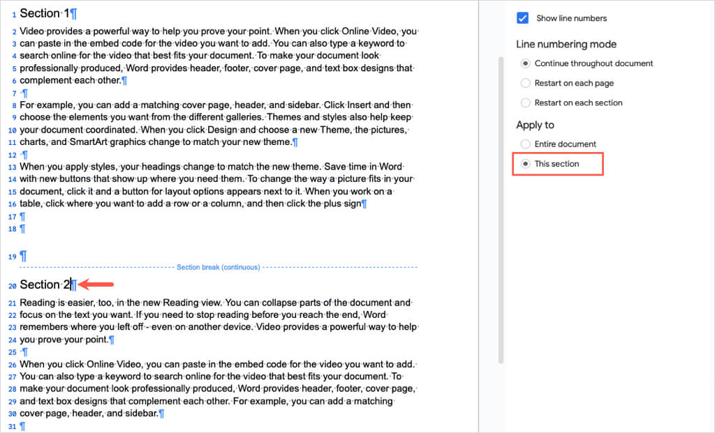 Voit noudattaa näitä samoja vaiheita numeroitaksesi muita asiakirjasi osioita samalla tavalla. Katso sitten tarvitsemasi rivi määrittämällä sen sisällä oleva osio ja linjanumero.