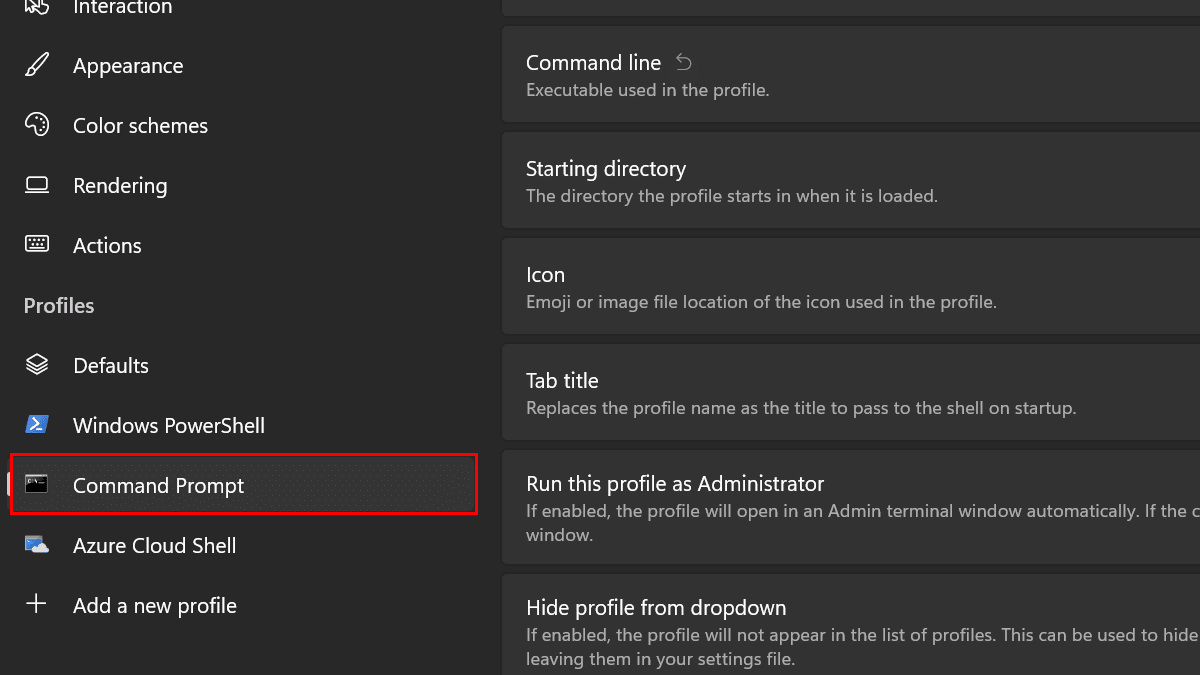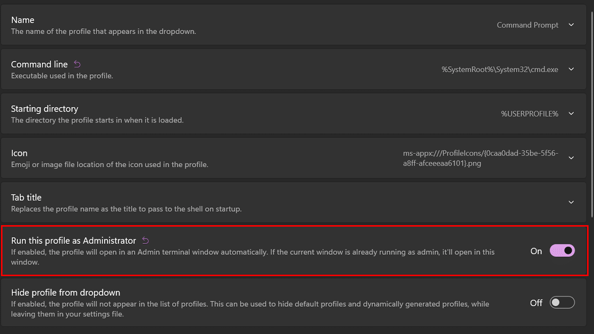 - Kytke ”Suorita tämä profiili järjestelmänvalvojana”Vaihda kytkin suorittaaksesi komentokehotteen korotettuna automaattisesti.