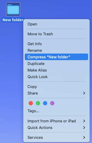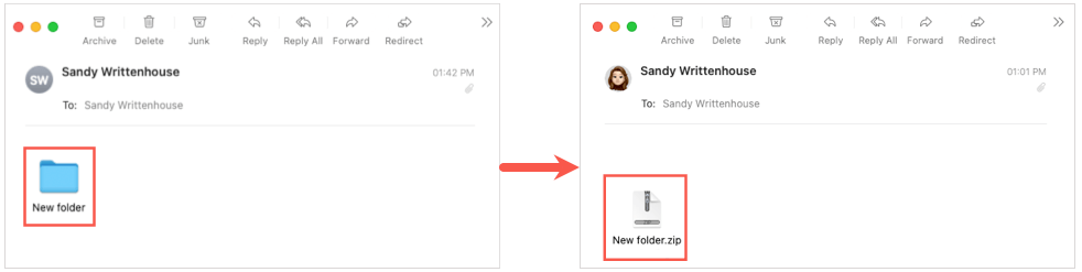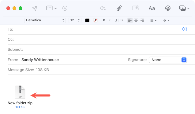 Mac toimii eri tavalla kuin Windows, kun kiinnität kansiota sähköpostiin. Voit tehdä niin puristamatta ensin kansiota. Apple Mail luo automaattisesti postinumero -tiedoston kansiolle sinulle, kun lähetät sähköpostia.