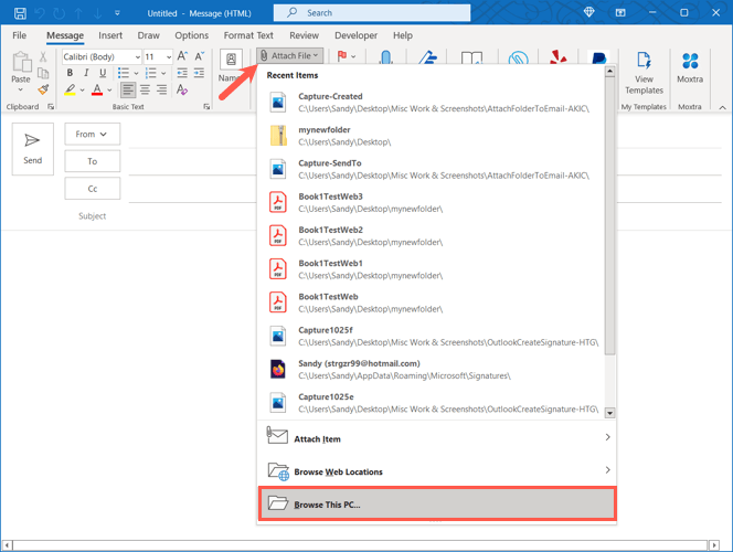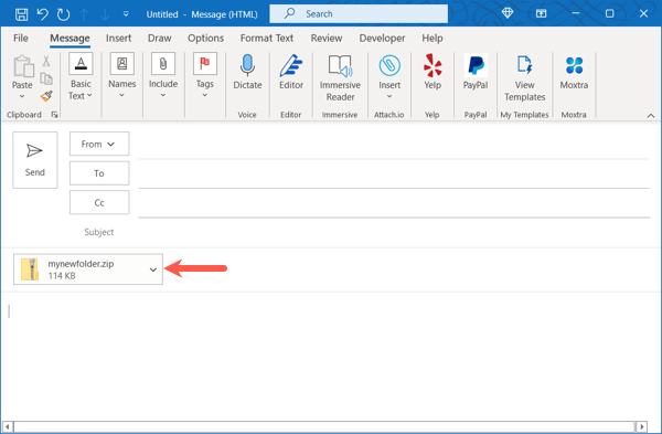 Kun yrität liittää kansion Microsoft Outlookin sähköpostiin, huomaat, että et voi tehdä niin. Outlook ei salli sinun liittää kansiota suoraan sähköpostiin. Kun olet pakattu se, voit kuitenkin liittää sen kuten mikä tahansa muu tiedosto.