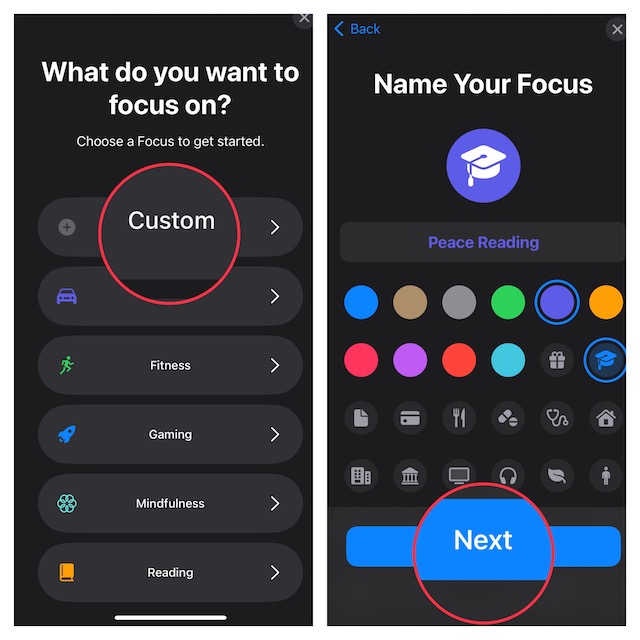 5.Seuraavaksi anna sopiva nimi tarkennuksellesi ja valitse kuvake. Napauta sittenSeuraava -> Mukauta ”Focus Profiil” -nimi.