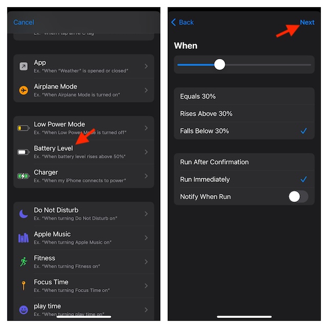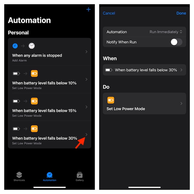 Tästä eteenpäin henkilökohtainen automaatio alkaa aina, kun iPhonen akkutaso saavuttaa tietyn prosenttimäärän valitulla tavalla.