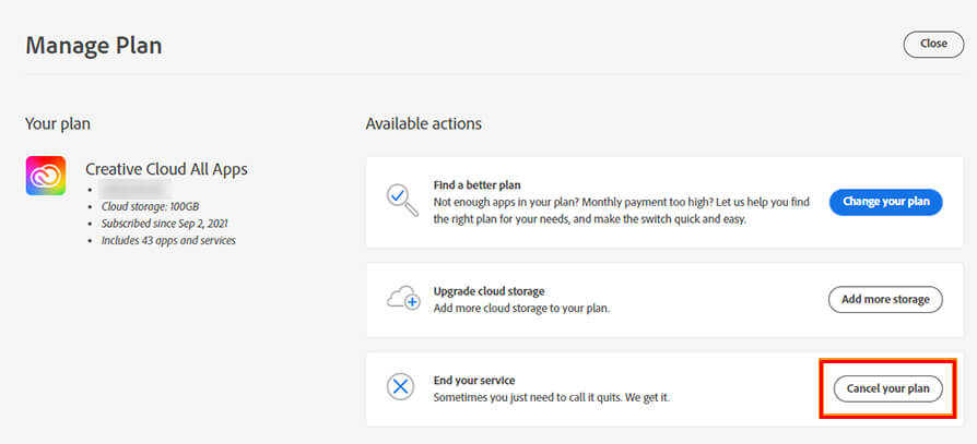 - Uusi ikkuna avautuu, jossa Adobe kysyy, haluatko muuttaa suunnitelmaasi vai peruuttaa sen. ValitsePeruuta suunnitelmasijatkaaksesi.