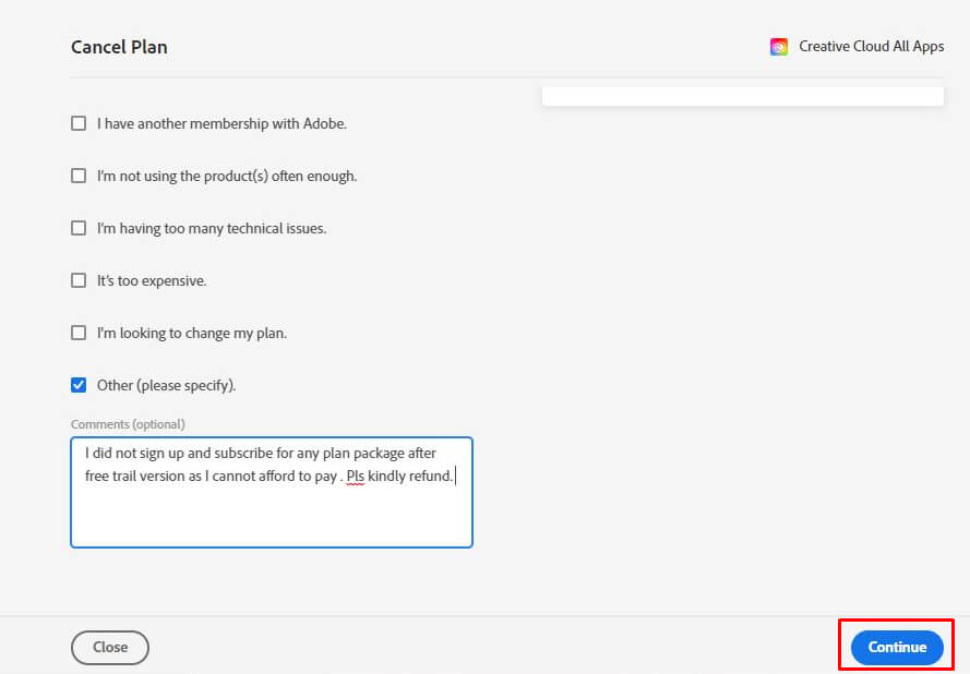- Valitse, miksi poistut Adobesta, merkitsemällä valintaruutu tapaustasi kuvaavan vastauksen vieressä. Voit myös kirjoittaa kommentin, jos koet sen tarpeelliseksi. Kun olet valmis, napsautaJatkaa.