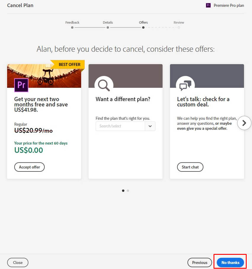 - Adobe ei pidä asiakkaidensa menettämisestä, ja he yrittävät uudelleen suostutella sinua muuttamaan suunnitelmaasi sen peruuttamisen sijaan. ValitseEi kiitosvaihtoehto, jos aiot peruuttaa Adoben.
