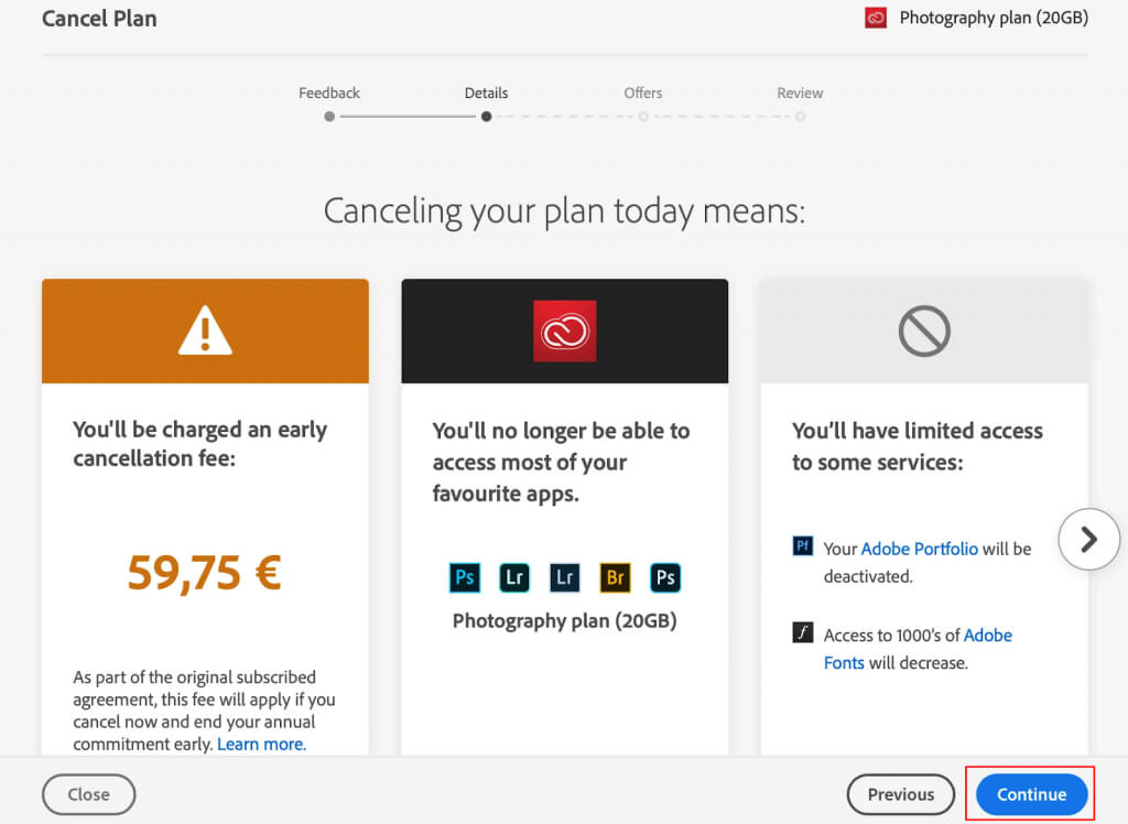 - Seuraavalla sivulla luetellaan Adoben tilauksen peruuttamisen seuraukset. Joskus sinun on maksettava maksu, ja hinta riippuu siitä, onko tilauksesi vuosi vai kuukausi. NapsautaJatkaalopettaaksesi peruutusprosessin.