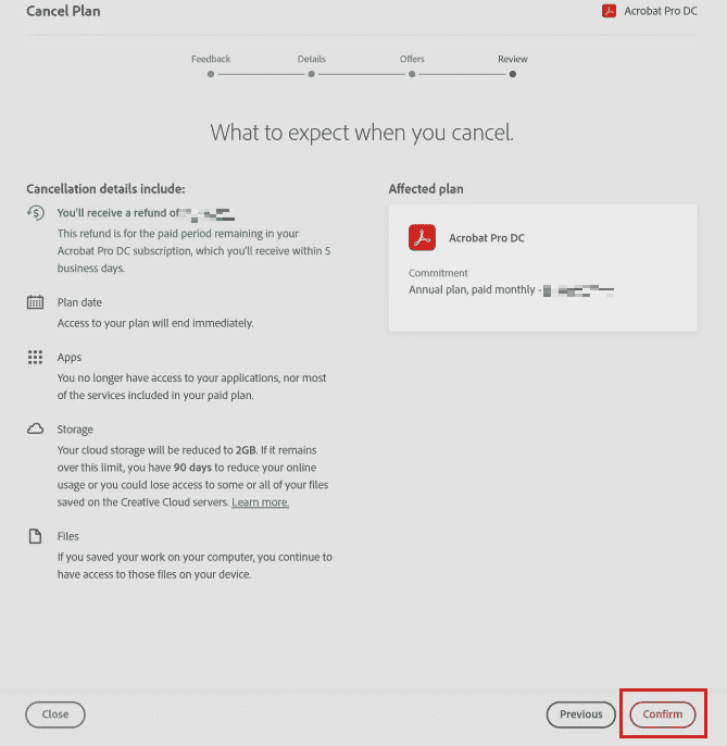 - Lopuksi seuraava sivu näyttää kaikki peruutustiedot. Tarkista ne, jotta olet varma, että niissä ei ole virheitä. ValitseVahvistaa, ja Adobe-tilauksesi peruutetaan.